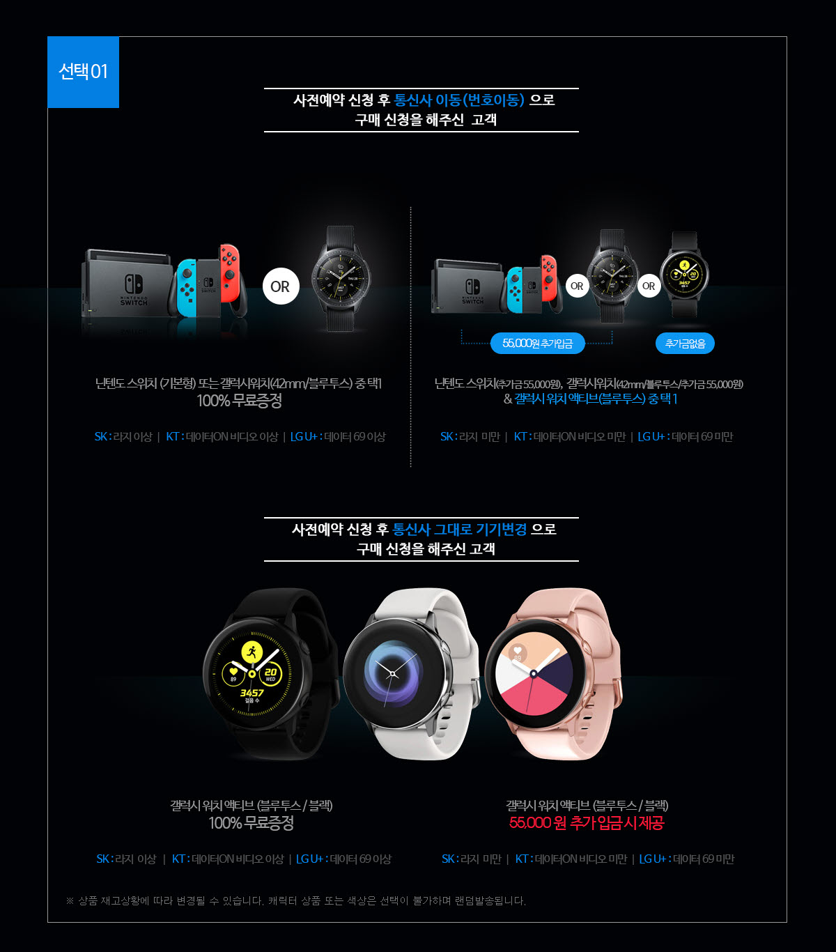 - 2명 이상 개통시 소니 플스 PS4 Pro, 닌텐도 스위치, 삼성전자 갤럭시탭S3 9.7 WiFi, 그래픽카드 지포스 RTX2060 6GB 중 1택